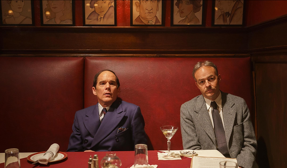 90% of the film takes place in famed Broadway restaurant/bar Sardi's, where caricatures of famed stage stars line the walls. Hawke's portrayal of Hart is not a caricature. He physically transforms into a much older man, always ready for a cigar, a shot of whiskey and a dose of gossip. The dirtier the story, the better.